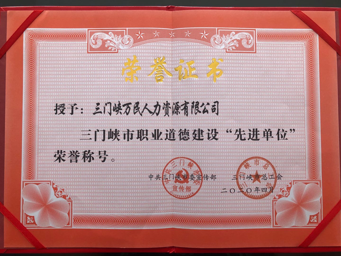 三門峽萬民人力資源有限公司榮獲了2019年度“三門峽市職業(yè)道德建設(shè)先進單位”榮譽稱號,我公司將繼續(xù)秉承“追求卓越、真誠服務(wù)、以人為本、奉獻社會”的經(jīng)營理念,不忘初心,砥礪前行,珍惜榮譽,充分發(fā)揮好先進典型的示范引領(lǐng)作用,扎實做好各項工作。